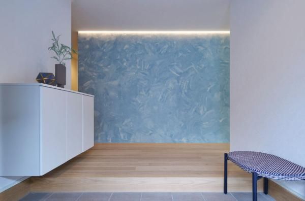 玄関を開けると、さわやかな青い壁が出迎えてくれます。 -