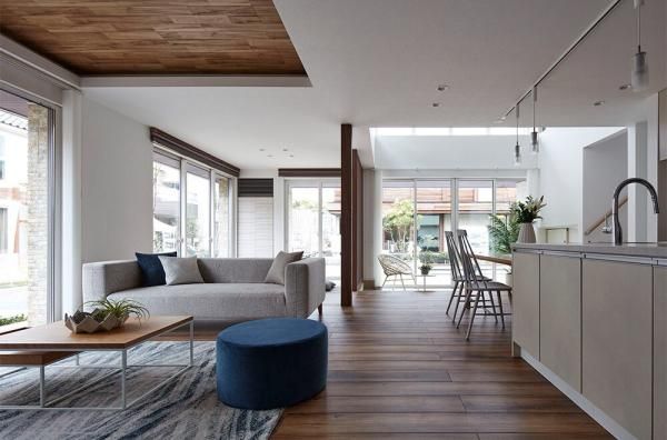 リビング青を基調としたインテリアが爽やかな雰囲気を演出。 折り上げ天井がフローリング素材になっており、アクセントを加えています。 -