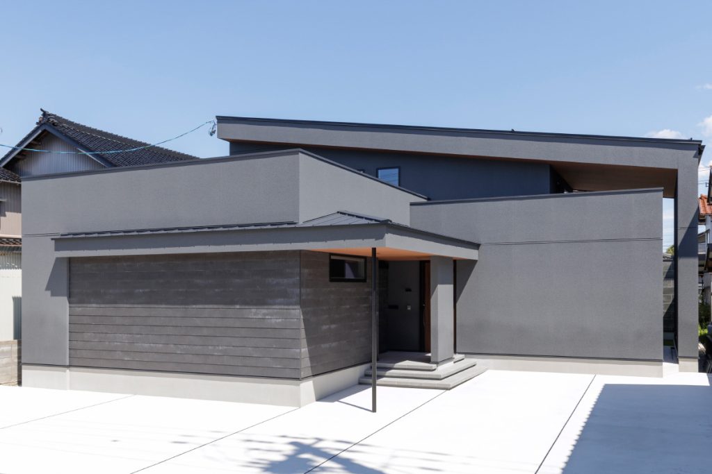 外観はシンプルモダンをベースにしながら、屋根勾配や窓配置に独自の工夫を加え、機能性とデザイン性を融合した建築美を追求しています。