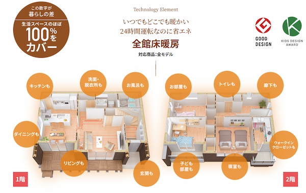 さらに高気密構造により空気の流れを最適化できるため、冷暖房効率も高く、なおかつ全館床暖房が標準で設置されているため、リビングだけでなく廊下や各部屋まで温度差が少ない特徴があります。