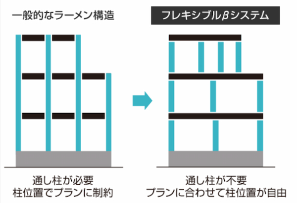 さらに3・4階建て住宅では、従来の「通し柱は動かせない」という制約を解消するフレキシブルβシステムを採用しています。