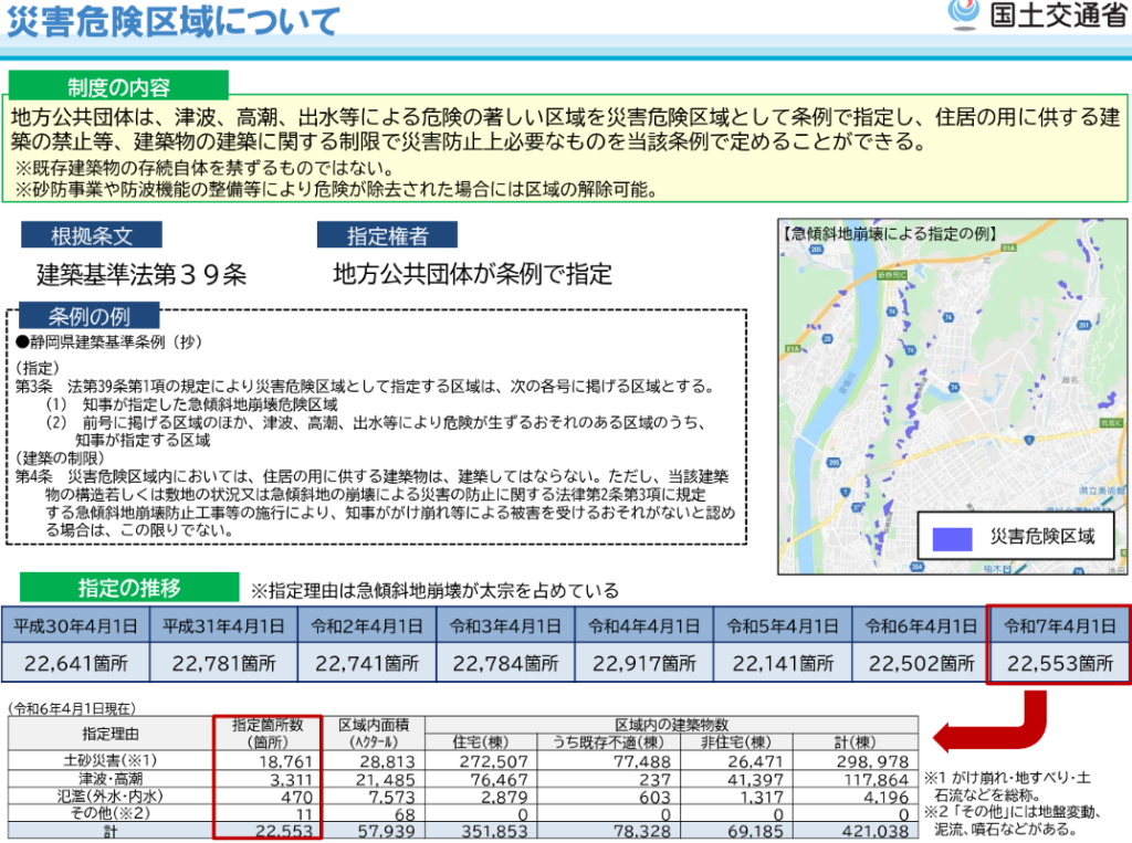 これは居住者の安全確保や、防災の観点から住宅立地を見直す目的があります。災害危険区域では「土砂災害特別警戒区域」「急傾斜地崩壊危険区域」「大規模な土砂流入や崩壊が想定される区域」など、人命に重大な危険が及ぶ可能性が高い区域でもあるのです。