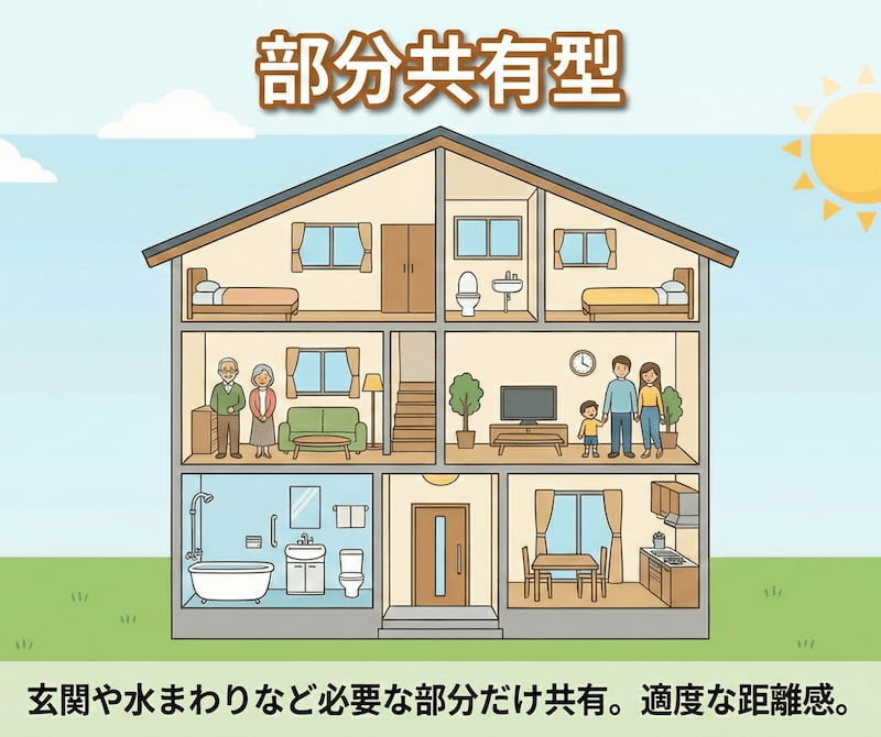 部分共有型:玄関や水まわりなど「必要な部分だけ共有」