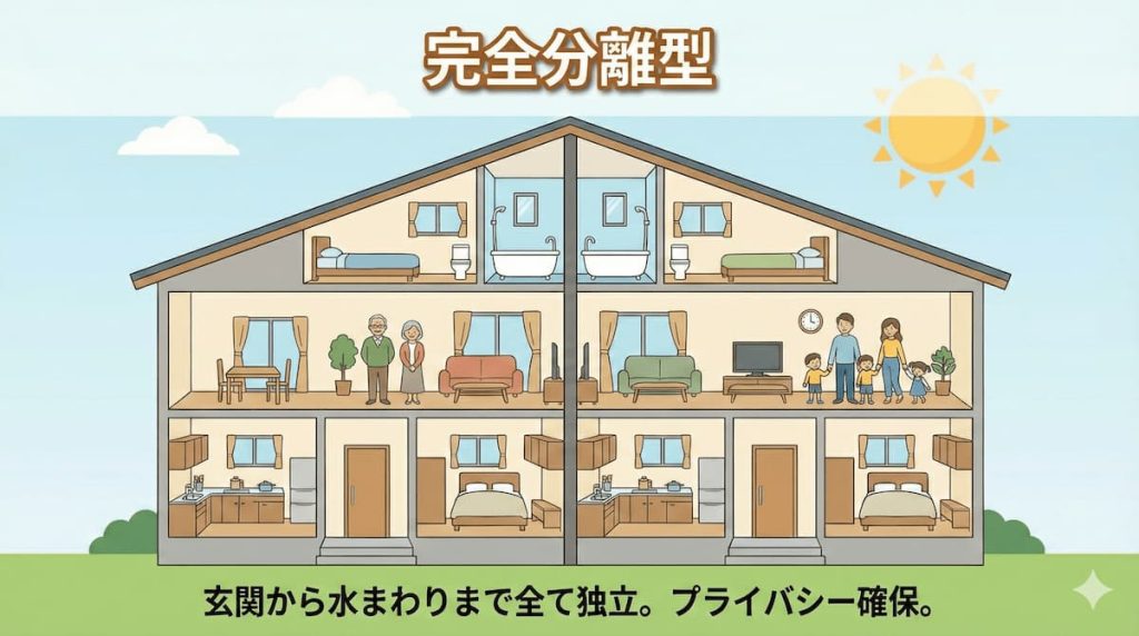 完全分離型とは、親世帯と子世帯それぞれが独立した生活空間と設備を持ち、日常生活を完全に分けて暮らす間取りスタイルです。